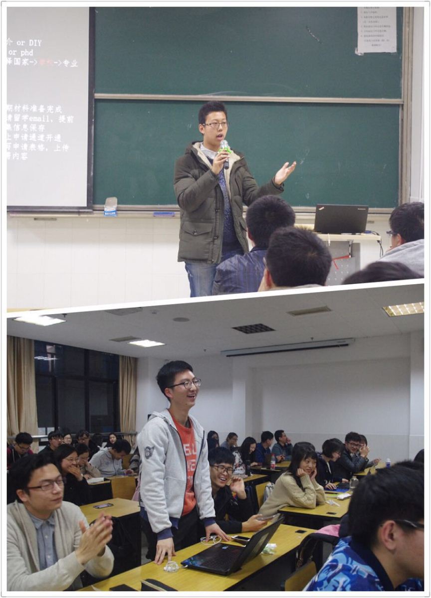 3月27日晚,“聚焦当下学习,引领生涯发展”2015级本学期学业指导首场经验分享会在理科楼B222成功举办。活动邀请到13级签约百度的陈子溦学姐及被美国莱斯大学录取的朱远清学长。两位同学分别从:基础学习、项目积累、社会工作、出国准备、实习经验等方面对大家进行了全方位的交流分享。2015级辅导员李恒超老师及100多位同学参与了此次活动。