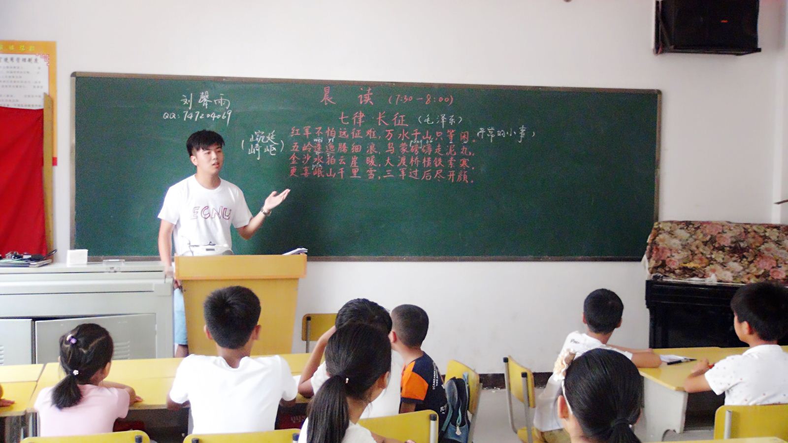 清晨,朗朗书声伴随着呖呖鸟鸣,唤醒了还在沉睡中的学校,假期中学校里怎会有书声传来?走近教室,原来是暑期支教志愿者刘馨雨正带领着大家朗读《七律·长征》,“红军不怕远征难,万水千山只等闲…”孩子们诵读之声洋洋盈耳,和支教的志愿者们一起开启了今天的学习专列。