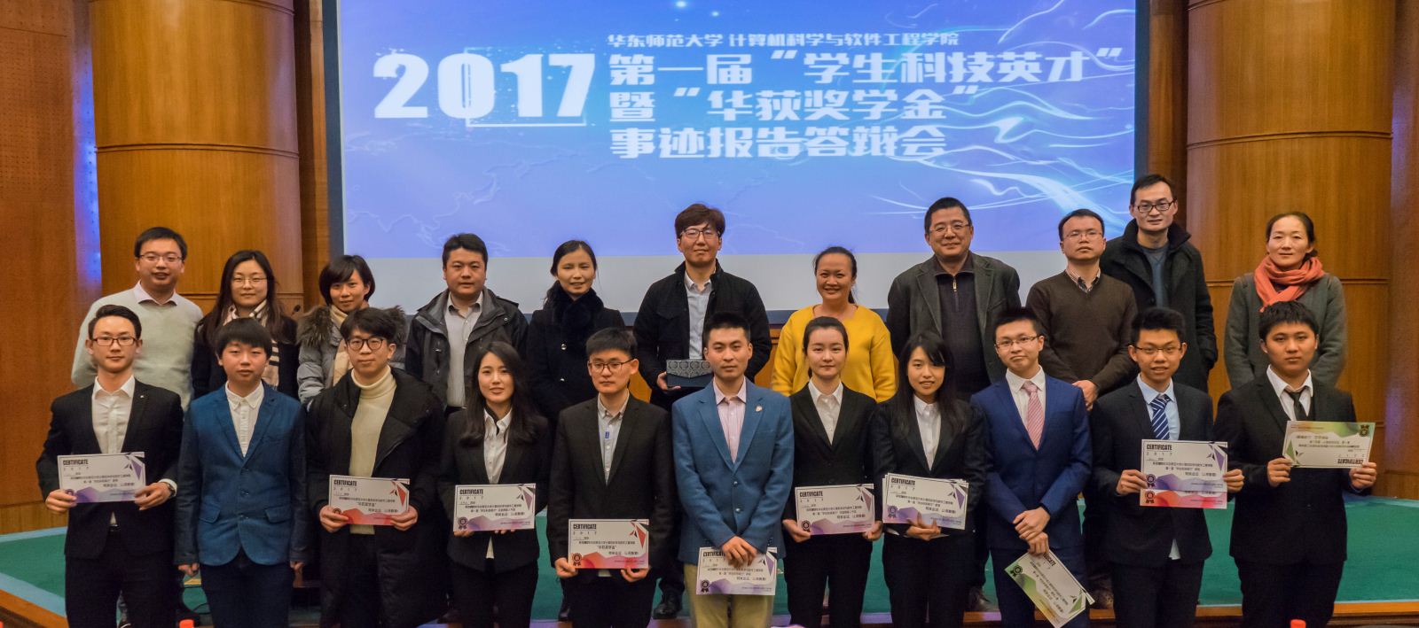 在上海华荻资产管理有限公司的资助下,我院设立“学生科技英才“暨”华荻奖学金”表彰在学术科研、科技创新方面表现突出的优秀学生。华荻公司CTO王南也来到活动现场并致辞,科技创新的迅猛发展给我们计算机与软件专业的学生提供了众多机会也带来了更大的挑战,他鼓励同学们要有梦想,学会坚持,要不断地学习,不断地提高自身素质。