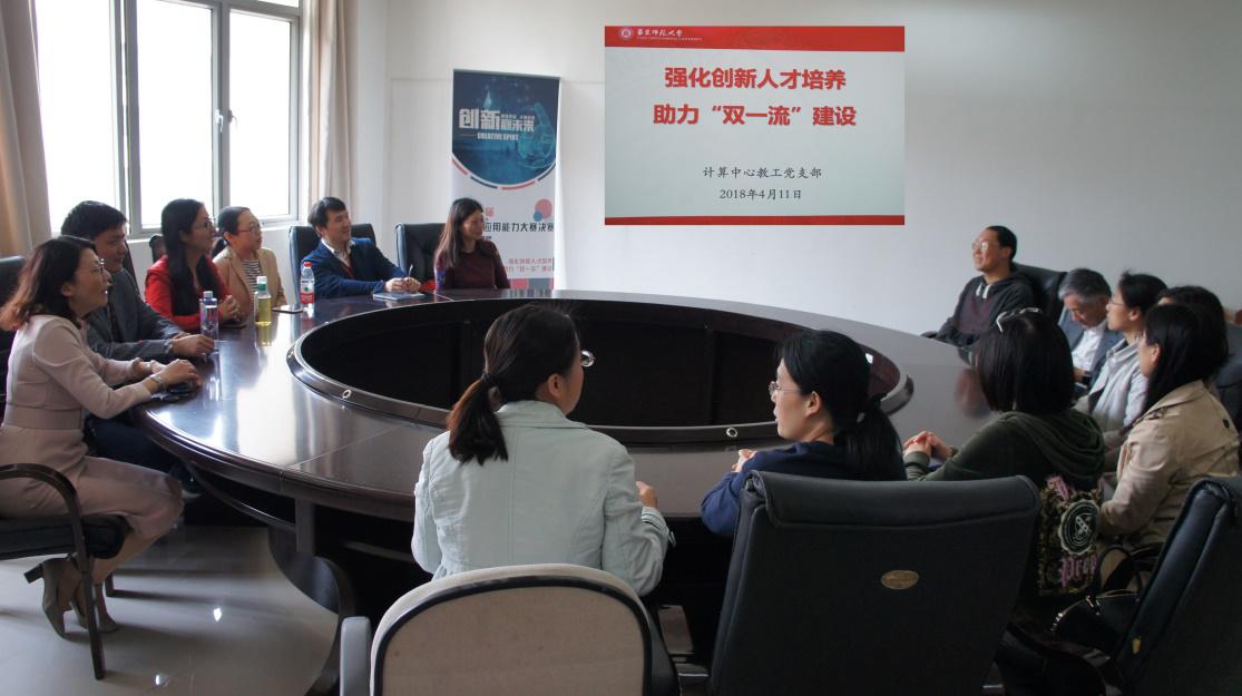 首先在支部书记朱敏老师的主持下,计算中心全体党员就十九大报告提出的“加快一流大学和一流学科建设、实现高等教育内涵式发展”的新要求进行了交流座谈。各位党员教师认为,计算中心应该根据教学特色及学科特长,更好地发挥“竞赛”平台优势,强化创新人才培养,助力学校“双一流”建设。计算中心党员教师应该在学校“双一流”建设中有效发挥高校基层党组织战斗堡垒作用和党员先锋模范作用。