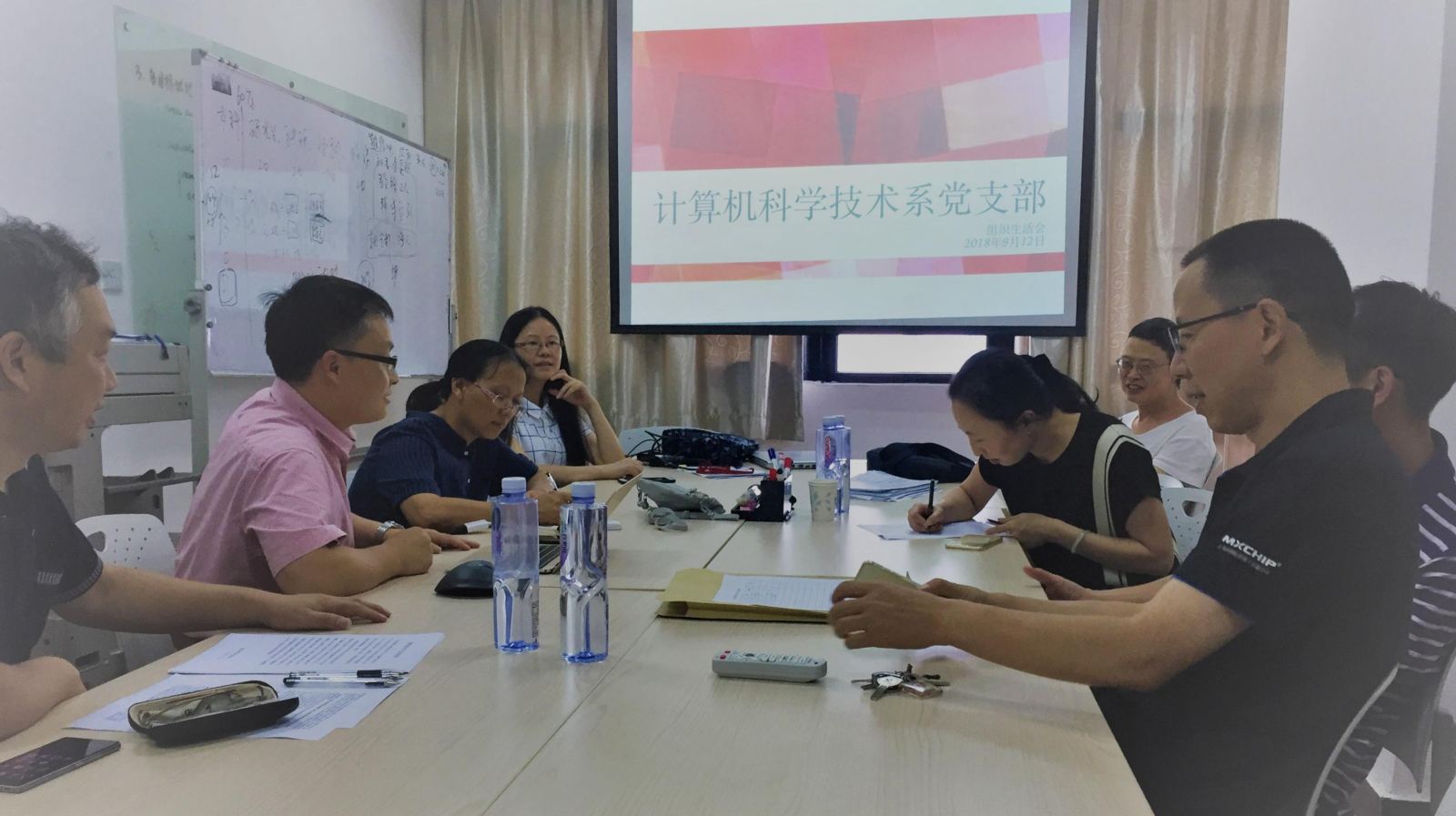 9月12日下午,在新学期开学之际,计算机系党支部在理科大楼B816会议室,举行“进博先锋 党员行动暨‘不忘初心、牢记使命、贯彻落实党的十九大精神’和新修订的《中国共产党纪律处分条例》学习”主题党日活动。会议由金健同志主持。