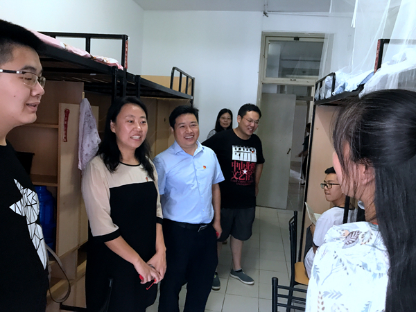 9月9日报到当天,学院党委书记兼常务副院长王长波,党委副书记兼副院长曹桂涛及辅导员佩戴党员徽章,深入学生寝室走访慰问新生,对话学生,希望他们在大学四年中学有所得,学有所成,为学校、学院的建设贡献力量。走访过程中,老师们细致地关心新生们学习生活中的方方面面,希望同寝室同学互帮互助、共同进步,构筑和谐的寝室氛围。