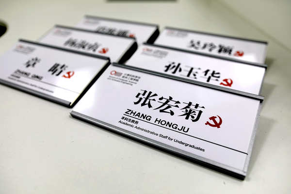 作为亮身份的重要环节,管理联合党支部,为所有服务部门在开学前精心制作工位牌,并为党员教师标注党徽。