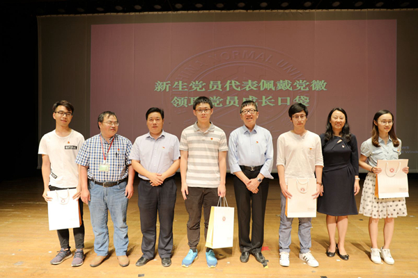 新生党员代表佩戴党员徽章领取党员成长口袋