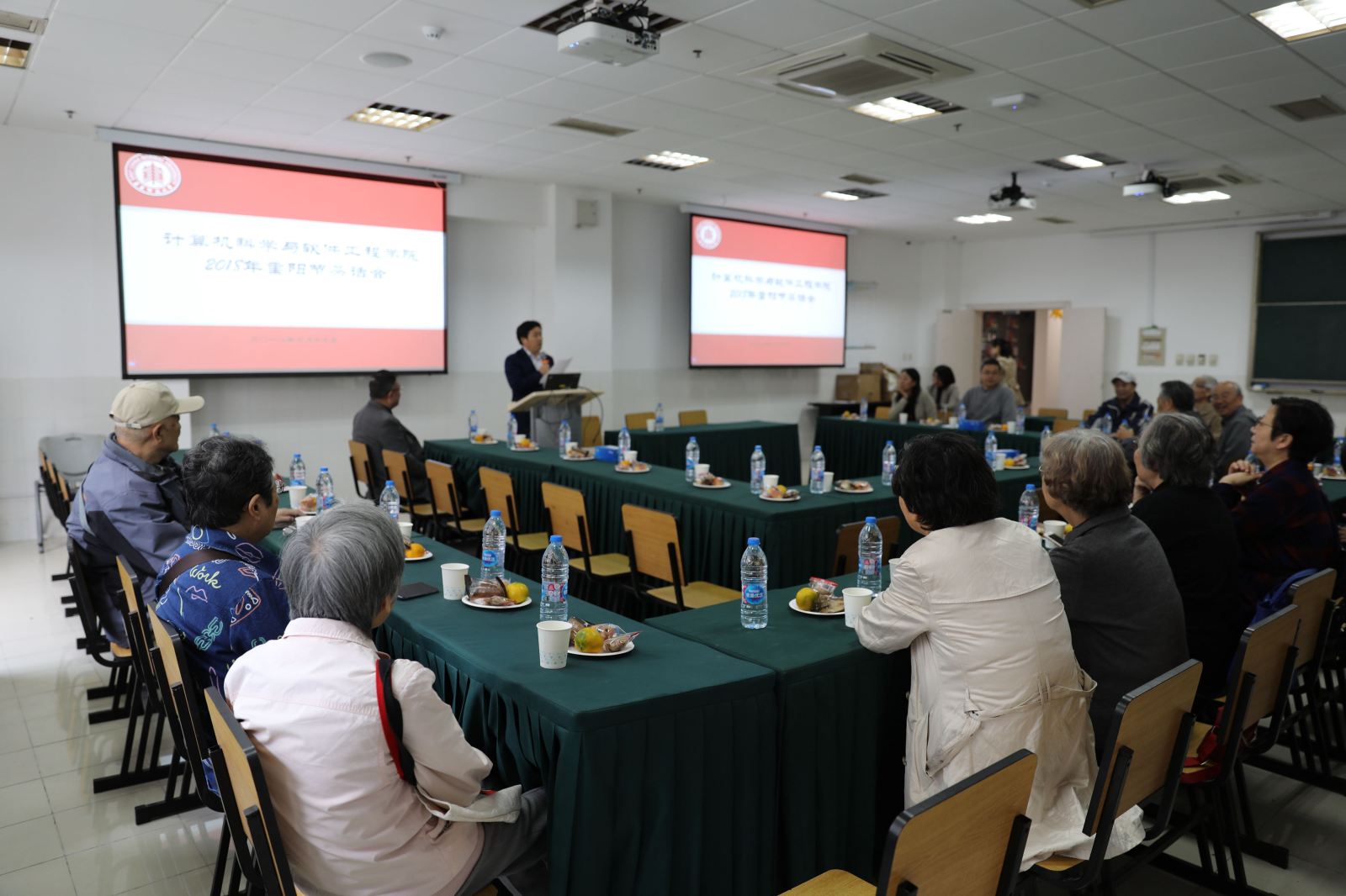 王长波书记首先代表学院欢迎退休教师们回娘家,并致以亲切的问候和节日的祝福。何积丰院长在讲话中谈到,老同志们是学院、学校的功臣,是国家的栋梁,老教师们的丰富经验与智慧是学院的宝贵财富,希望大家继续支持学院发展建设,共同分享学院的发展成果。同时,何院士关切地嘱咐老同志们保重身体,欢迎常回家看看。