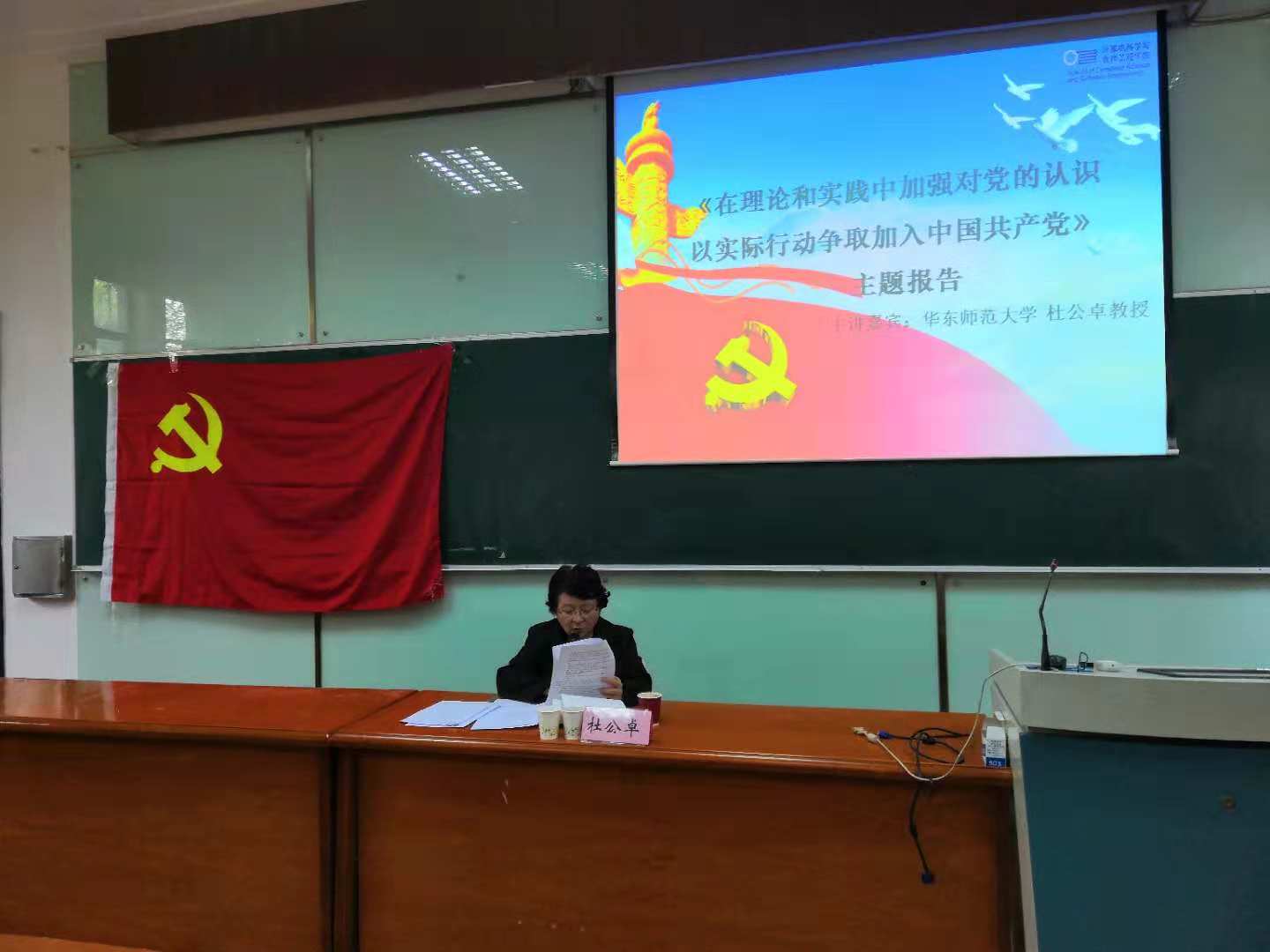 金秋十月,党旗飘扬,10月31日下午,计算机科学与软件工程学院的党章学习小组在数学馆113开展第三次学习活动。本次活动邀请到我校原党委副书记、学院特邀党建员杜公卓教授,为同学们做“在理论和实践中加强对党的认识,以实际行动争取加入中国共产党”主题报告,使学员明确新时期共产党员的标准和当代大学生肩负的历史责任,端正入党动机,以实际行动争取早日加入中国共产党党组织。