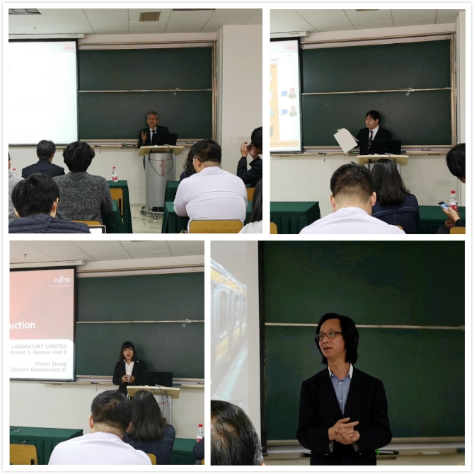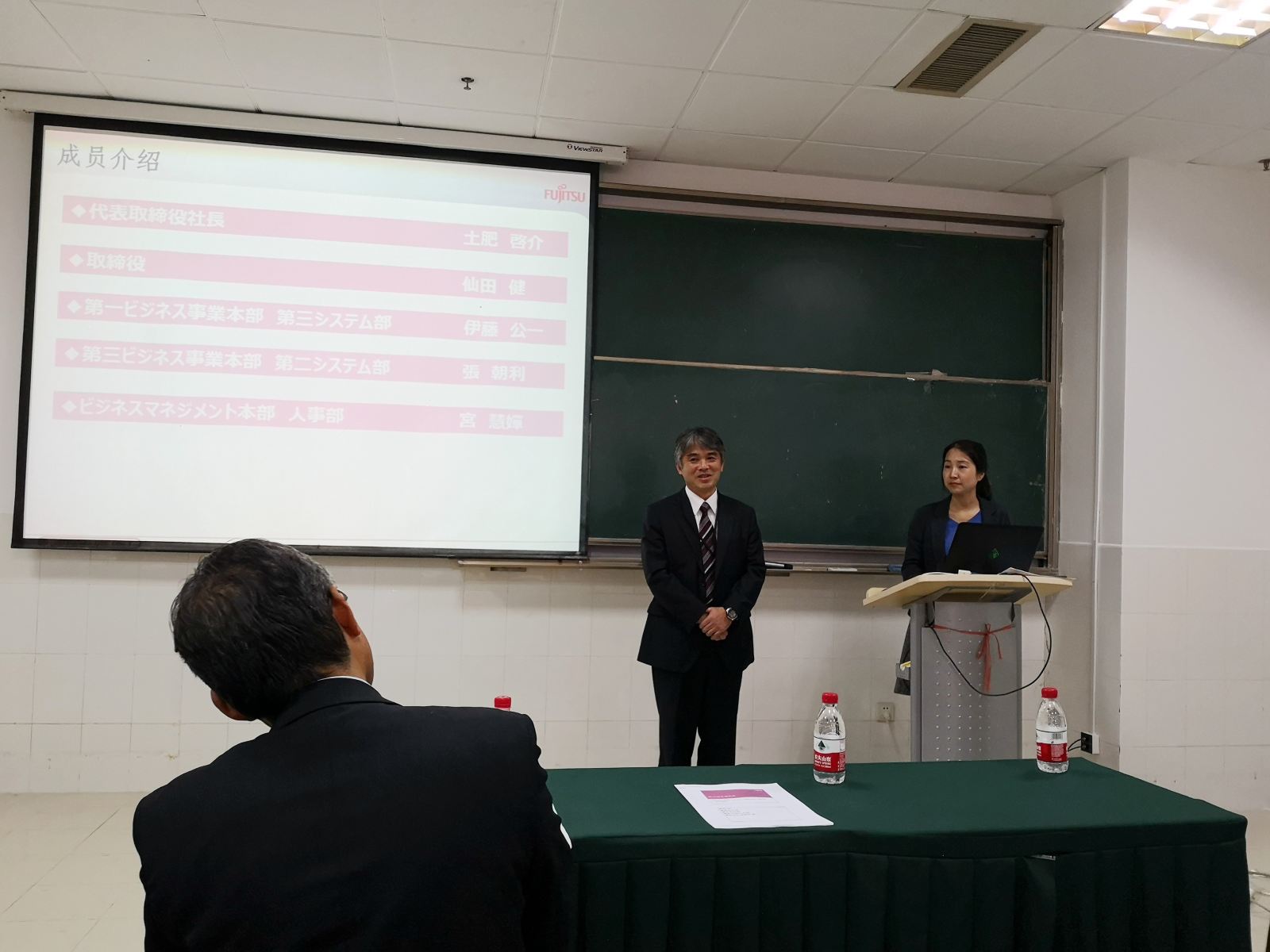 富士通土肥社长首先讲话,他鼓励同学们主动了解、把握机会,并表示富士通十分欢迎各位同学前去实习。董事仙田先生用中文为同学们介绍了富士通集团、富士通SSL,介绍了他们的有关项目、企业合作机构以及赴日实习的详细内容,虽然仙田生的汉语并不流利,但他坚持用中文交流,蕴含着来宾们真挚的诚意。伊藤先生和张朝利小姐先后向同学们介绍了公司里两个部门情况。赴日实习项目中方负责人陈定和老师对整个说明会进行了收尾和总结,并表达了对于下一届赴日实习生们的热烈欢迎。