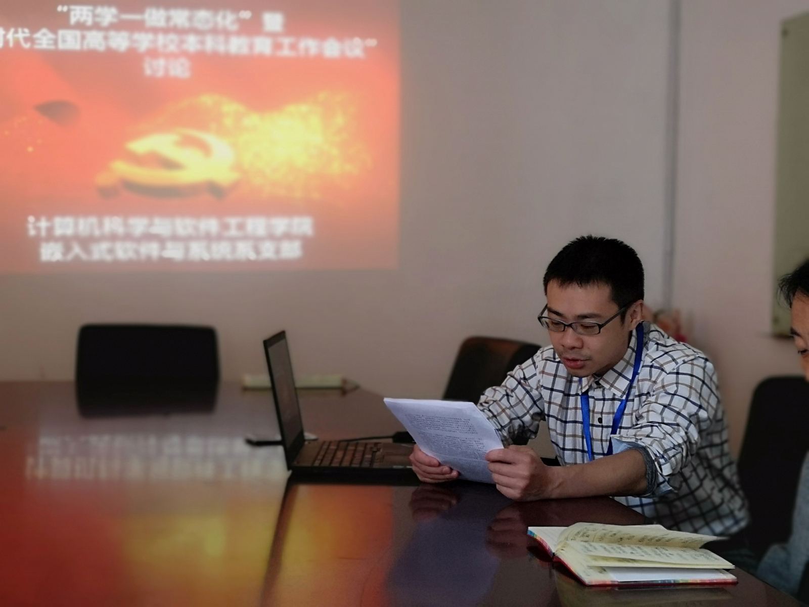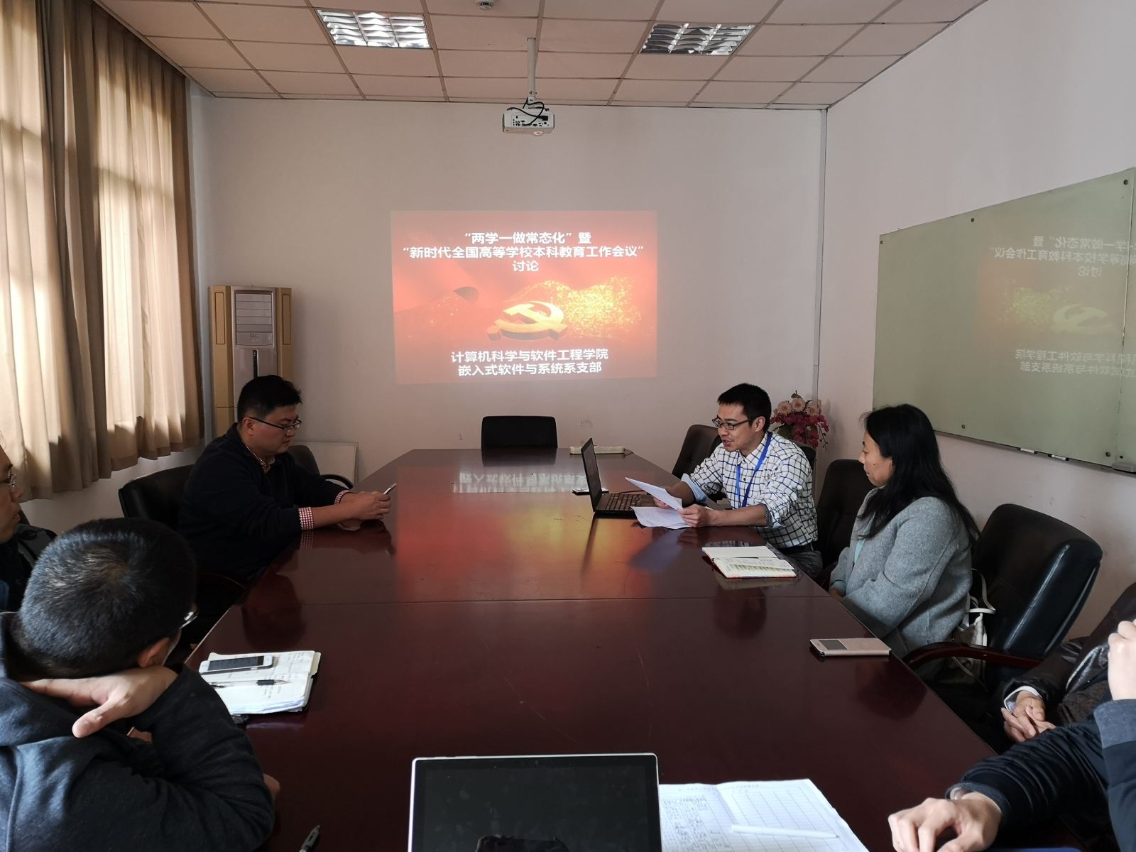 11月28日,嵌入式软件与系统支部就“两学一做”常态化开展了关于教育精神的学习。首先,支部书记缪炜恺老师介绍了教育部党组书记、部长陈宝生同志在新时代全国高等学校本科教育工作会议上的“坚持以本为本 推进四个回归 建设中国特色、世界水平的一流本科教育”重要讲话。带领支部同志们深入学习了陈宝生部长关于进一步做好本科教育工作谈到的“深刻学习领会习近平新时代中国特色社会主义思想,牢牢把握高等学校的根本任务和根本标准”、“坚持以本为本,推进四个回归”和“写好‘奋进之笔’,建设高水平本科教育”三个意见及指示精神。
