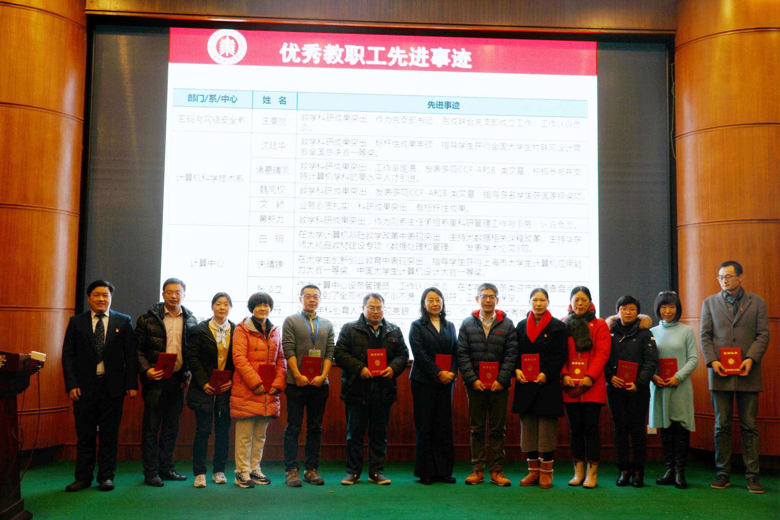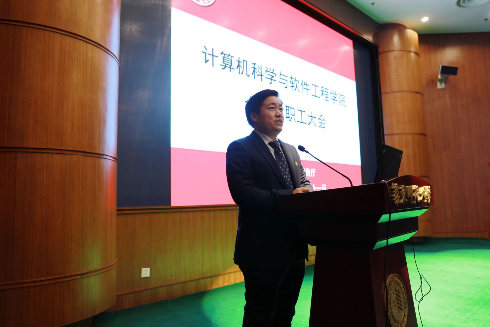 1月11日,计算机科学与软件工程学院在中北校区逸夫楼报告厅举行全院教职工大会,隆重表彰先进。大会由学院工会主席宫学庆主持,党委书记兼常务副院长王长波,党委副书记兼副院长曹桂涛,副院长周爱民,副院长王晓玲及全体教职工共200余人出席大会。