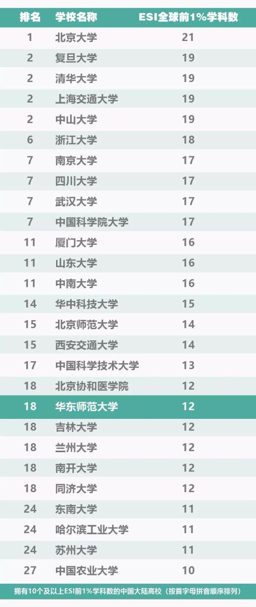 根据2019年3月最新数据,在ESI统计的22个学科中,华东师大共有12个学科进入相关学科领域全球高校及科研机构排名前1%,数量居中国大陆高校第18位。
